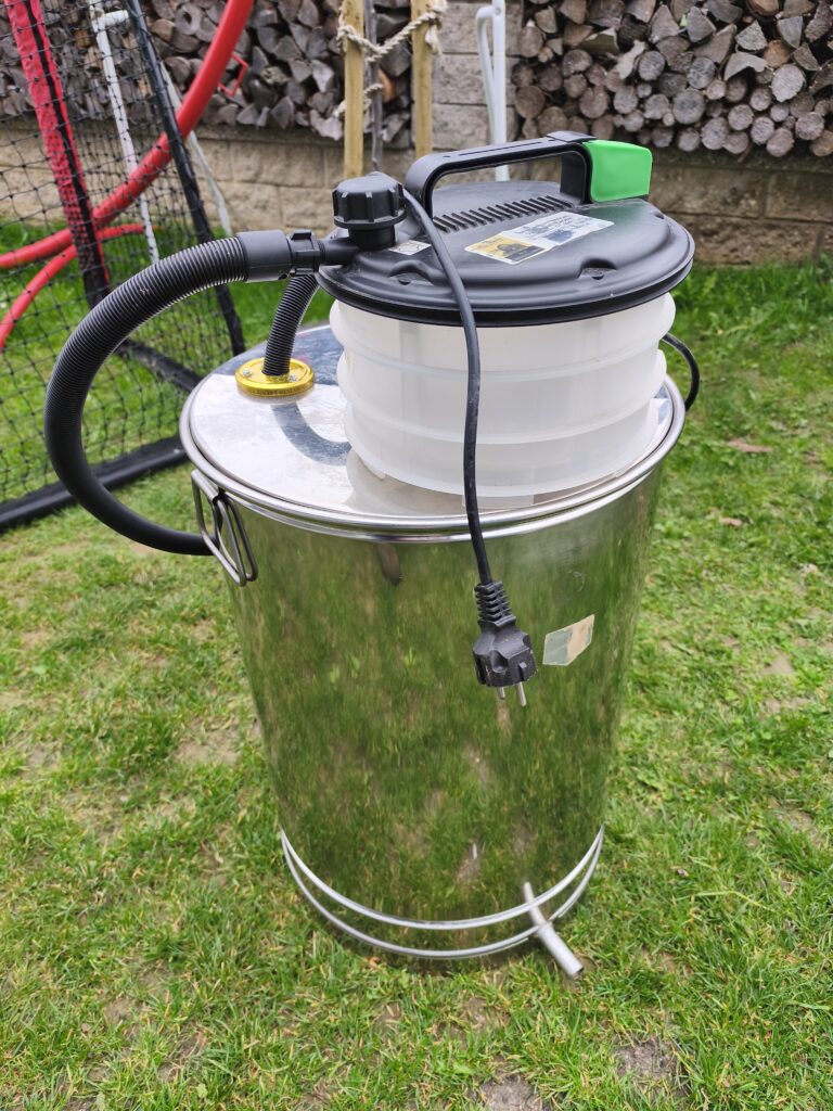 Besteht aus einem rostfreien Edelstahl-Behälter D-43cm, Höhe 63 cm, einem gelochten Innenkorb am Behälterboden und einem Dampfmeister 230V, 1800-1950 Watt.