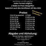 Sommertracht-Blütenhonig. Qualitätsauszeichnung in GOLD: Wassergehalt: 16,7 % Invertase: 176 SE Ernte: 31.07.2025 Abgefüllt in 25 kg. Hobbock. Kann aber wenn gewünscht auch in Gläser flüssig oder Cremig abgefüllt werden. Preis…