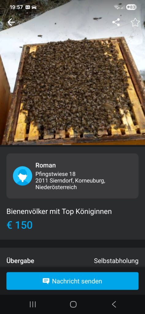 Verkaufe 15 Völker (Königin 2024 oder 2025) -Zandermaß (457mm) -eigener Wachskreislauf -Ameisensäurebehandlung im Sommer -Restentmilbung Oxalsäure -Abholung im März -Preis 160€/Volk. Mindestabnahme 5 Völker Kontakt gerne per Whatsapp
