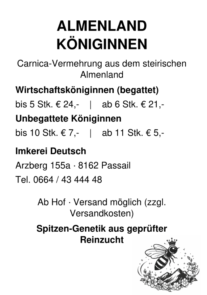 mit Carnica Belegstellenkönigin 2024 (Döllersheim), gezeichnet (grün) Auf frischem Wabenbau von 2025 (Totale Brutentnahme und Bauerneuerung), eigener Wachskreislauf. Mit negativem AFB Befund, Varroabehandlung mit Oxalsäure (Haupt- und Restentmilbung) € 160,-…